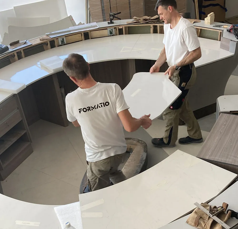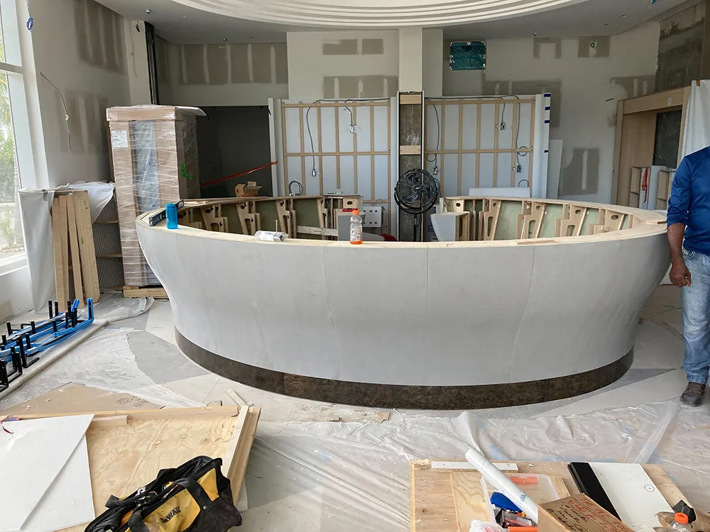 Al centro del design si trova un bancone reception, simbolo di innovazione, meticolosamente modellato da Formatio in 3D con materiale minerale per creare un punto focale visivamente sbalorditivo che cattura i sensi. Scopri i passaggi seguenti nella creazione di questo bancone, dal design CAD all'installazione finale.