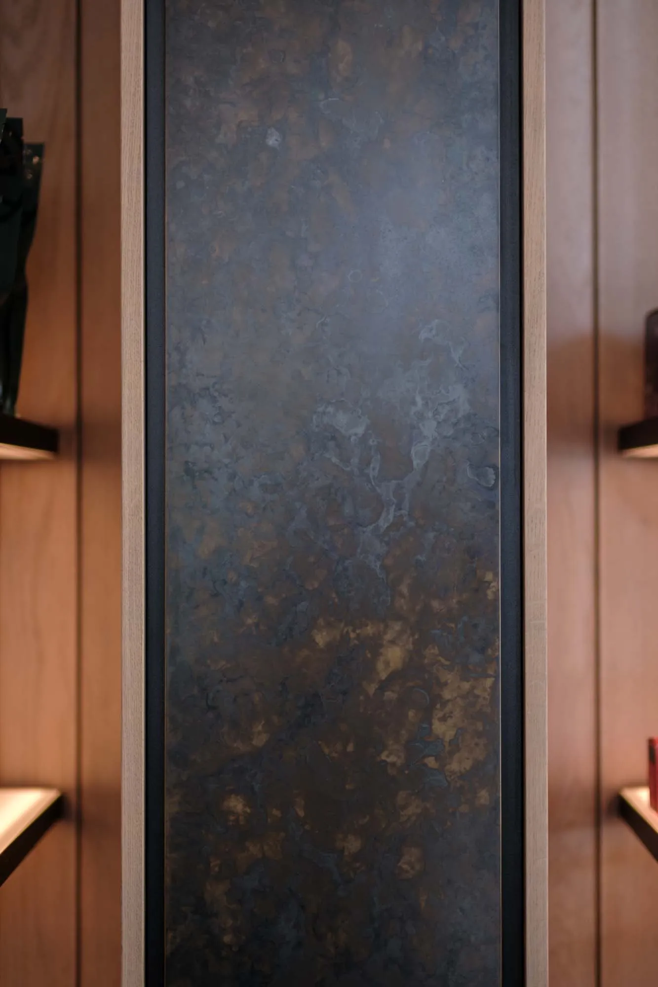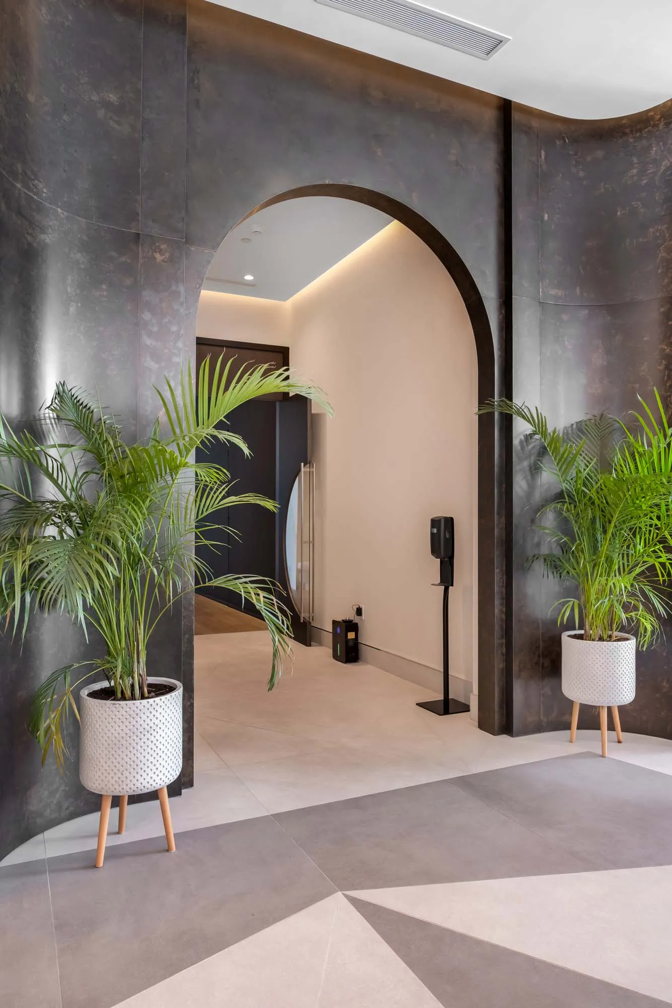 Una caratteristica distintiva sviluppata in accordo con la visione dell'interior designer è stata la pannellatura delle pareti rivestita in metallo liquido, un impegno artistico per aggiungere un tocco sfumato di raffinatezza e unicità all'ambiente della palestra.