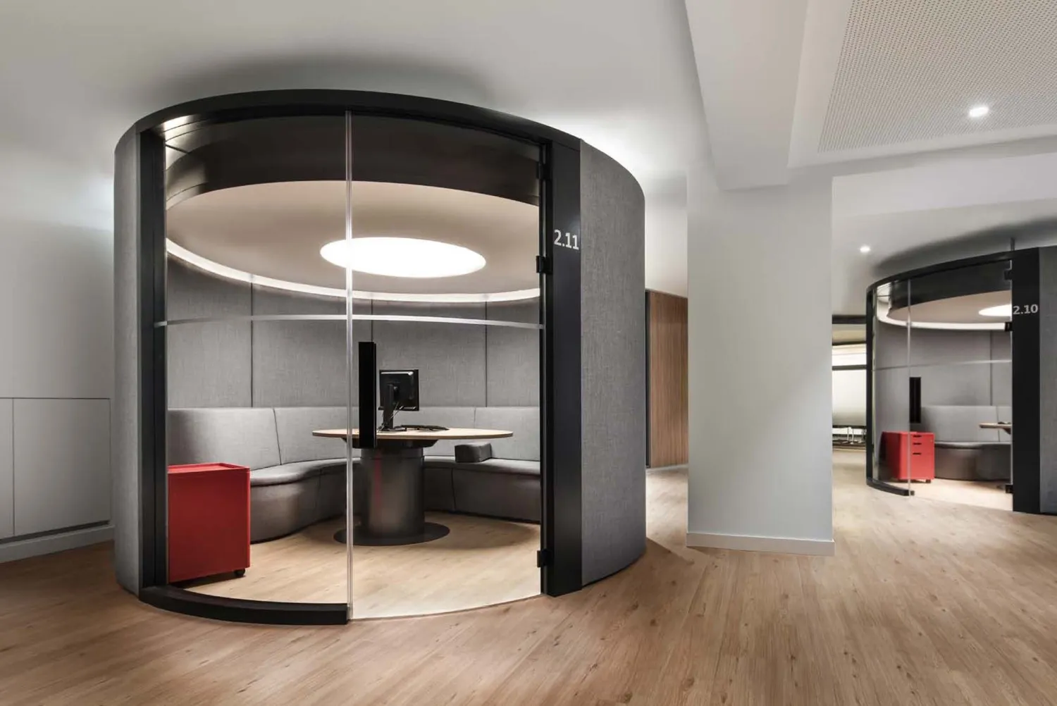 Costruzione di box riunioni su misura e personalizzati che consentono riunioni silenziose e riservate all'interno del più ampio spazio pubblico della banca.