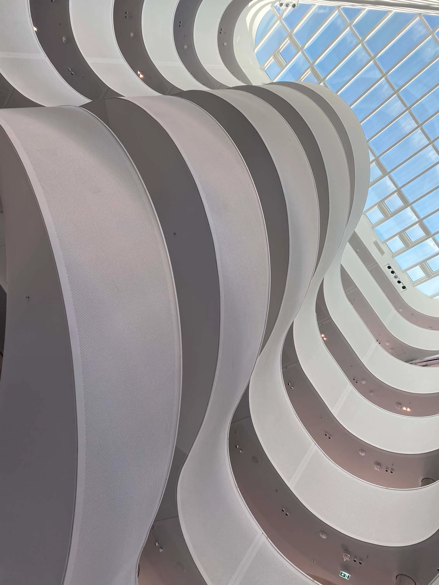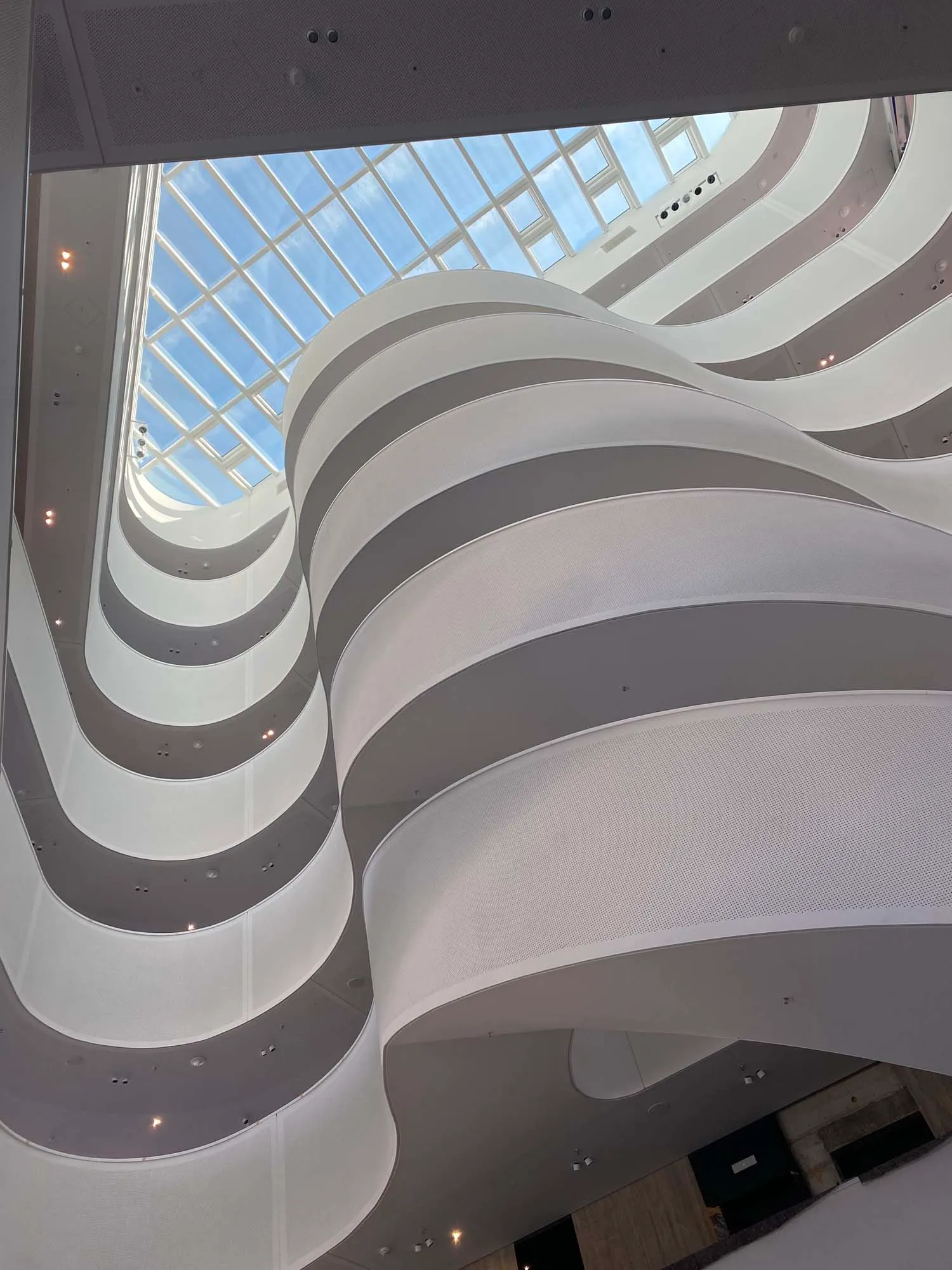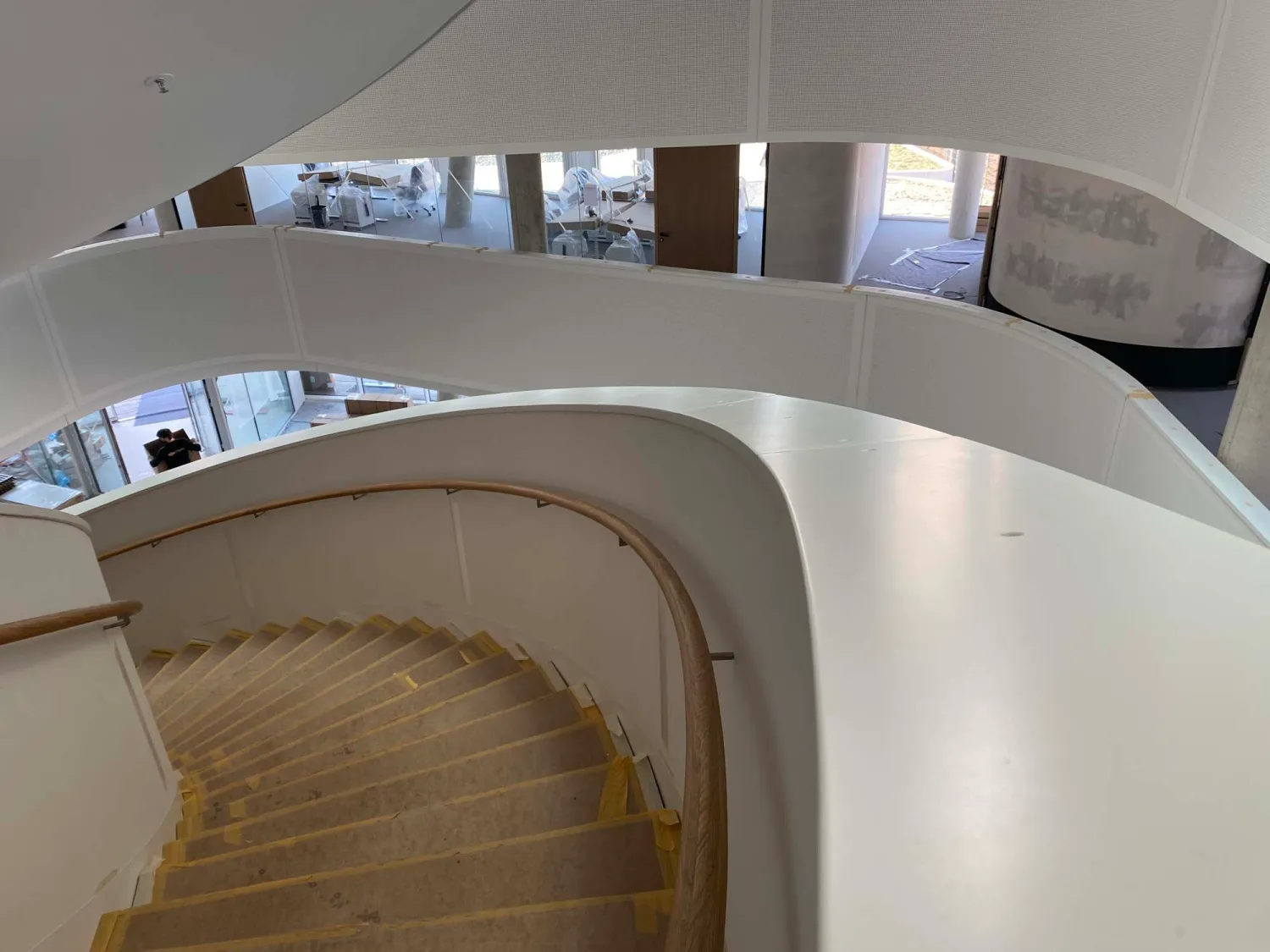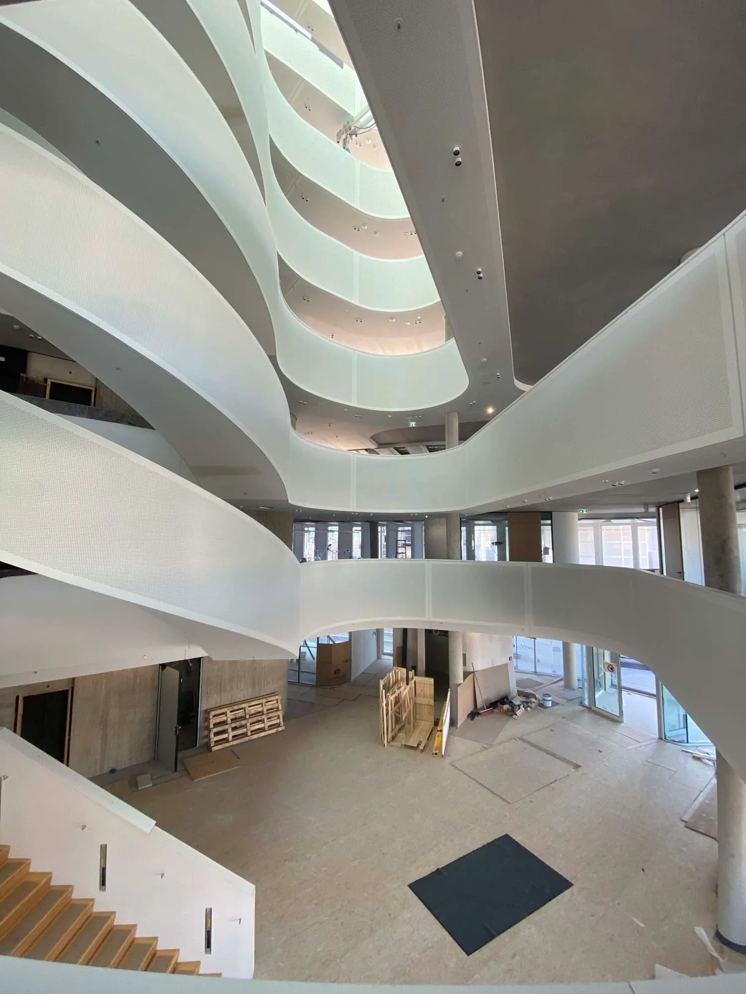 Visitando oggi l'edificio completato, la forma fluttuante della scala a sbalzo si erge come simbolo di innovazione all'interno del più ampio spazio interno.